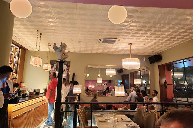The décor is deliberately evocative of a traditional French bistro with black and white tiled floors, quirky wall pieces, warm and inviting booths with leather banquettes and Art Deco Lights. The restaurant is buzzing and alive when we enter and remains full till we leave.